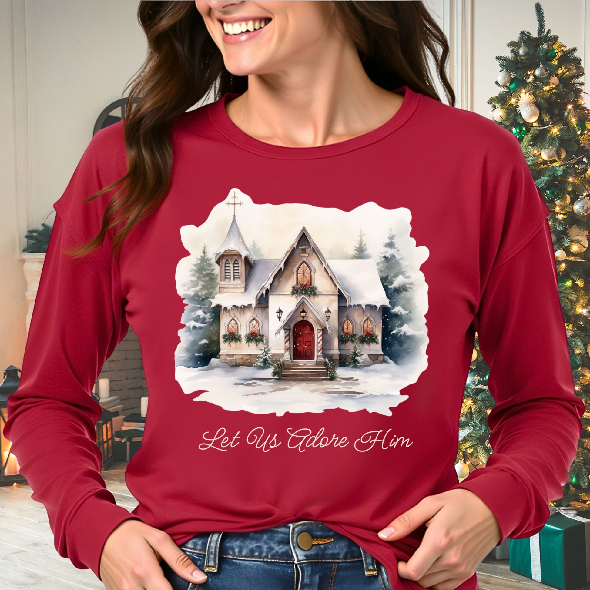 Let the calm beauty of the season surround you in this long sleeve tee featuring a snow-covered country chapel, decked with festive greenery and holiday wreaths. With soft watercolor textures and a classic country feel, it’s the perfect way to wear your love of cozy Christmas charm. ❄️🏠