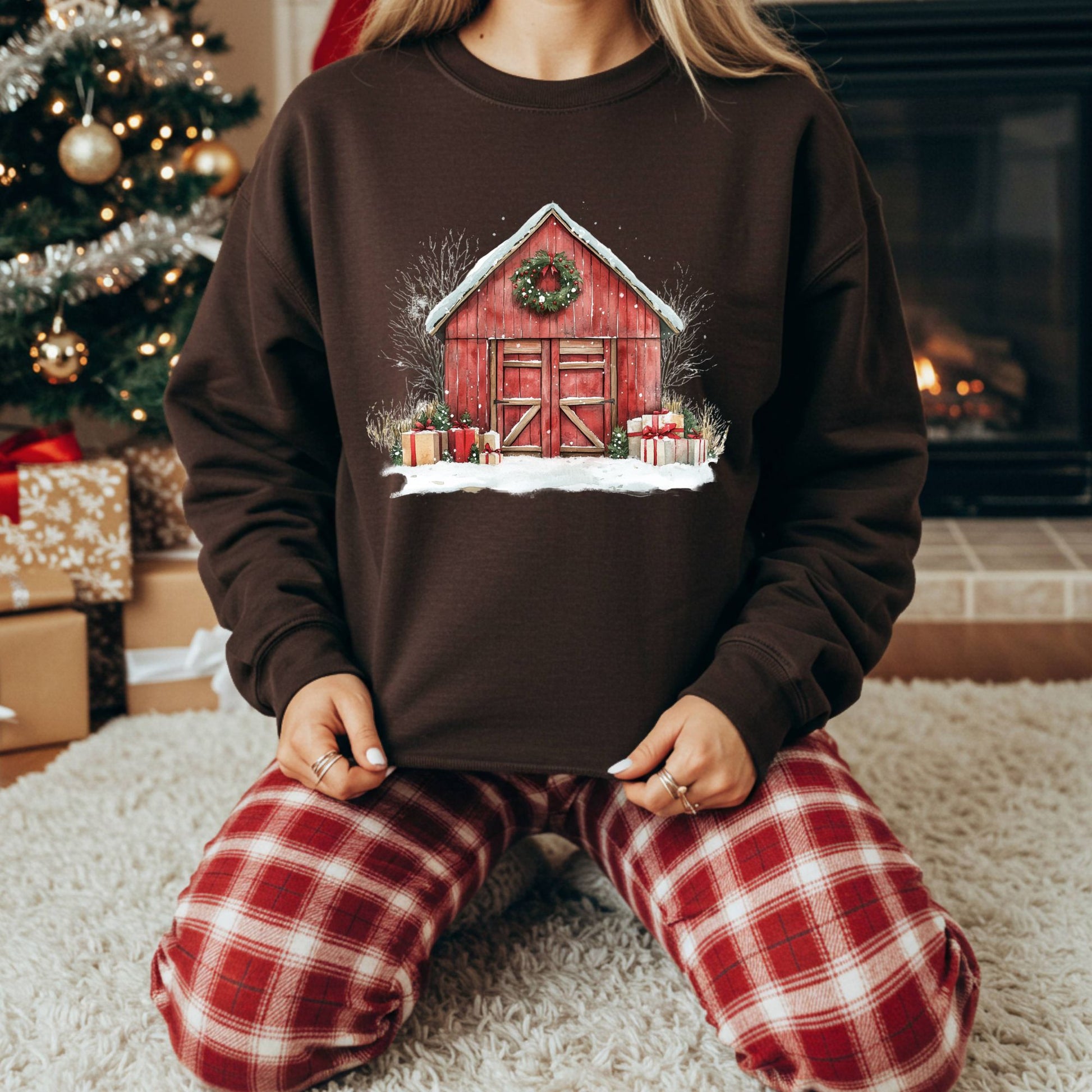Capture the peaceful beauty of a country Christmas in this cozy sweatshirt featuring a watercolor red barn surrounded by snow and gifts out front. The rustic, cottagecore design evokes the warmth of simpler times โ where holidays meant fresh pine, twinkling lights, and hearts full of joy. Soft, durable, and beautifully made for the seasonโs coziest moments.
