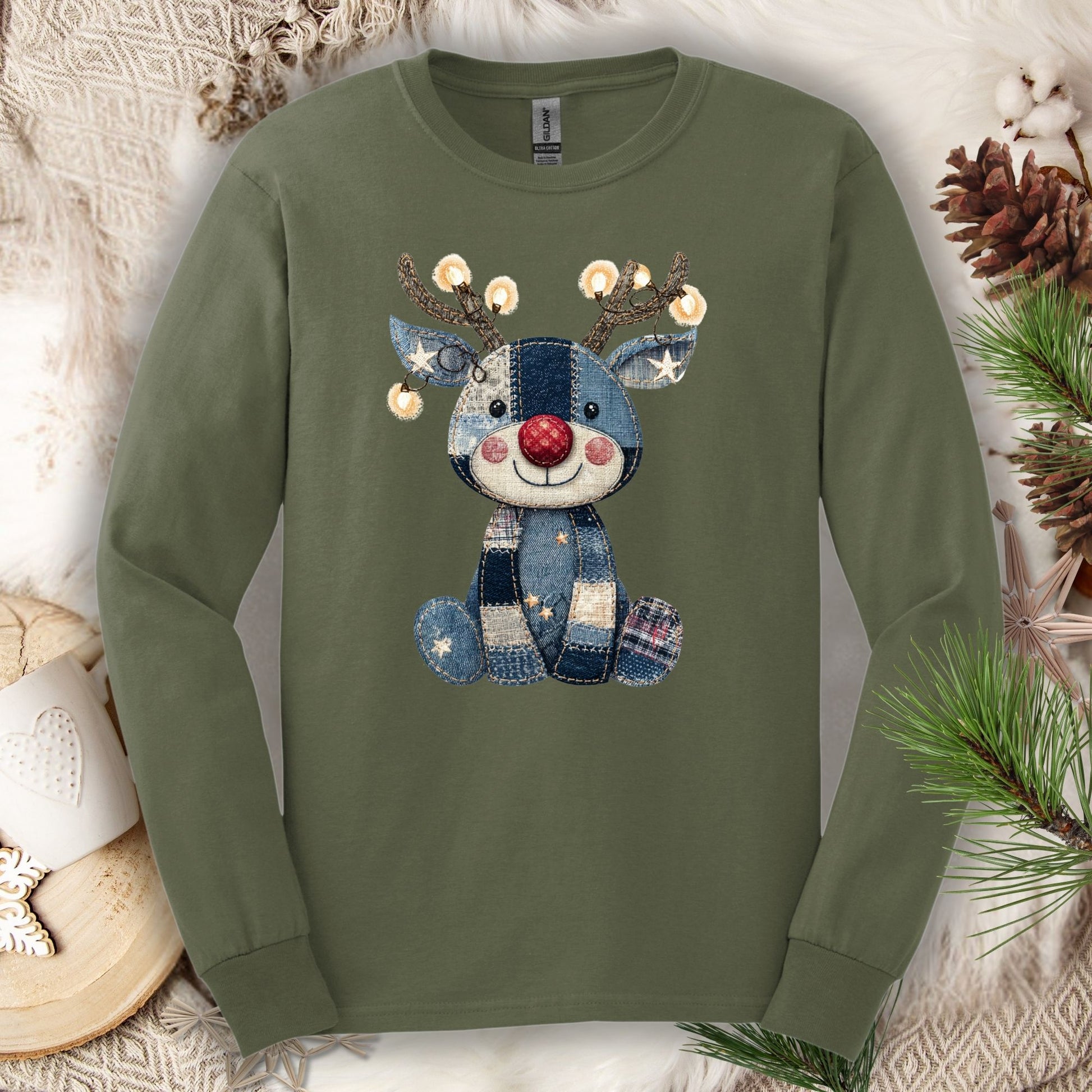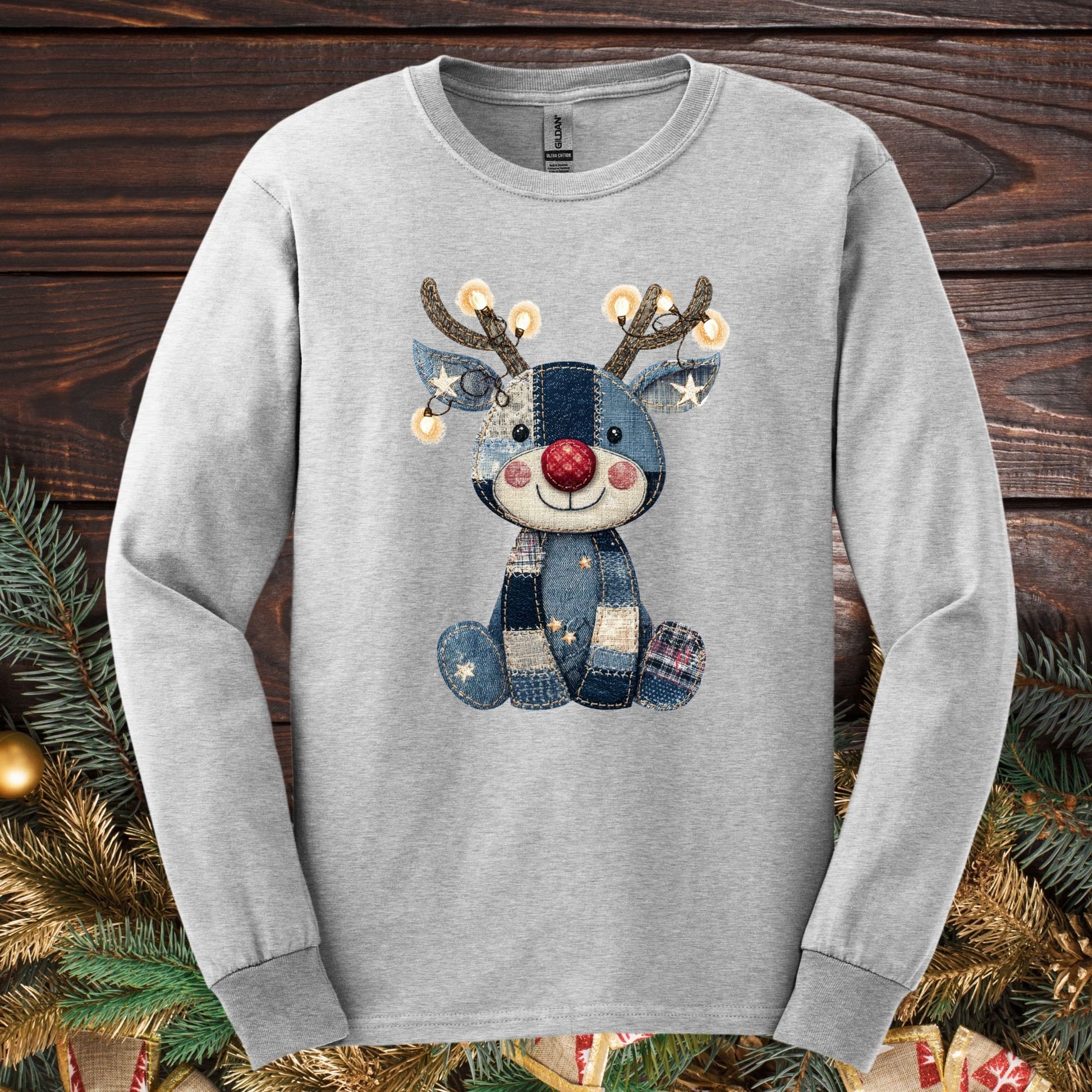 Celebrate the joy of the holidays in soft, playful style with this long sleeve tee featuring a darling denim patchwork baby Rudolph print. 🦌💙 His antlers sparkle with a string of Christmas lights, and his stitched patchwork textures give off cozy, handmade charm — the perfect blend of cute and classic holiday cheer. Please note this design is professionally printed on the top and is not embroidered or sewn on.