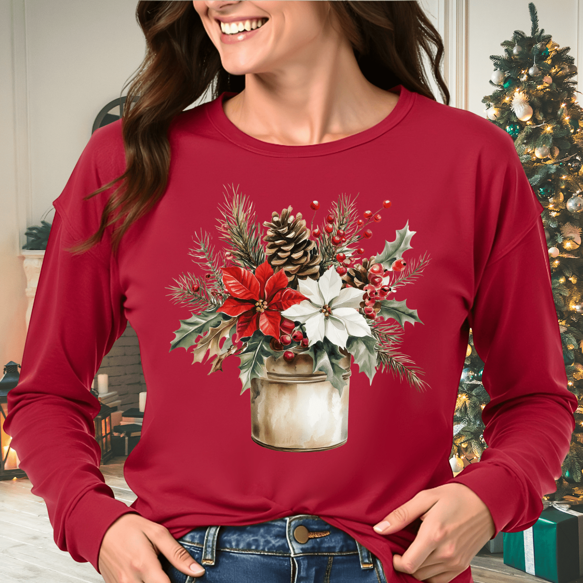 Bring festive charm to your winter wardrobe with this lovely watercolor design featuring a rustic metal jar filled with red and white poinsettias, holly berries, and evergreen sprigs. The soft, painterly details capture the heart of a country Christmas — classic, cozy, and timelessly beautiful. 🌺🎄❤️