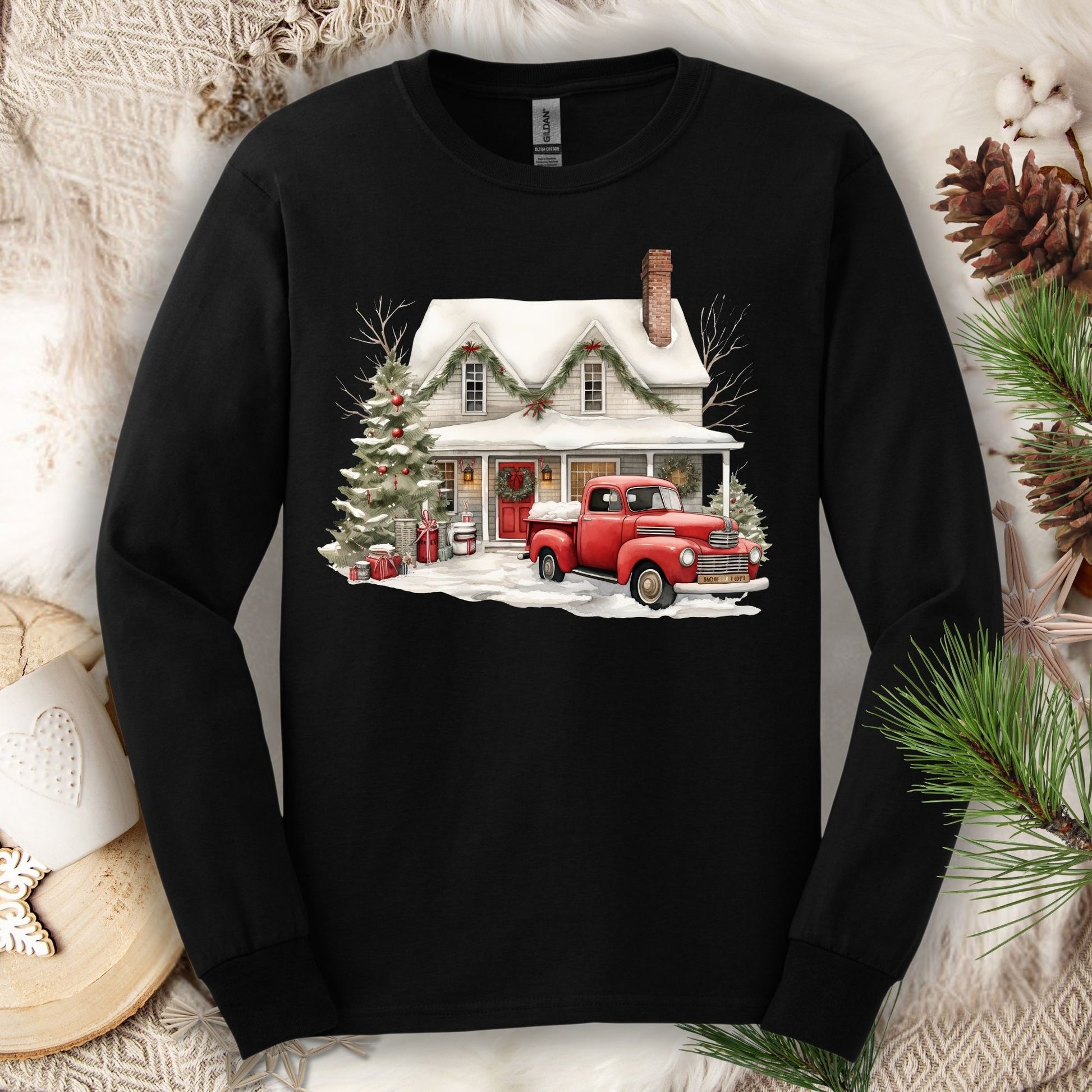 Bring the peaceful beauty of a farmhouse Christmas to your wardrobe with this Gildan long sleeve tee. Featuring a watercolor design of a rustic red pickup parked beside a snow-covered farmhouse and evergreen tree, this piece captures the simple joys of the holidays — cozy, nostalgic, and full of heart. ❄️🎁