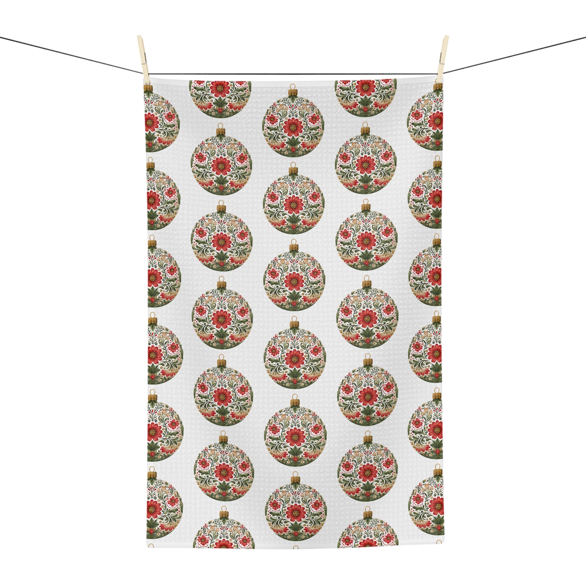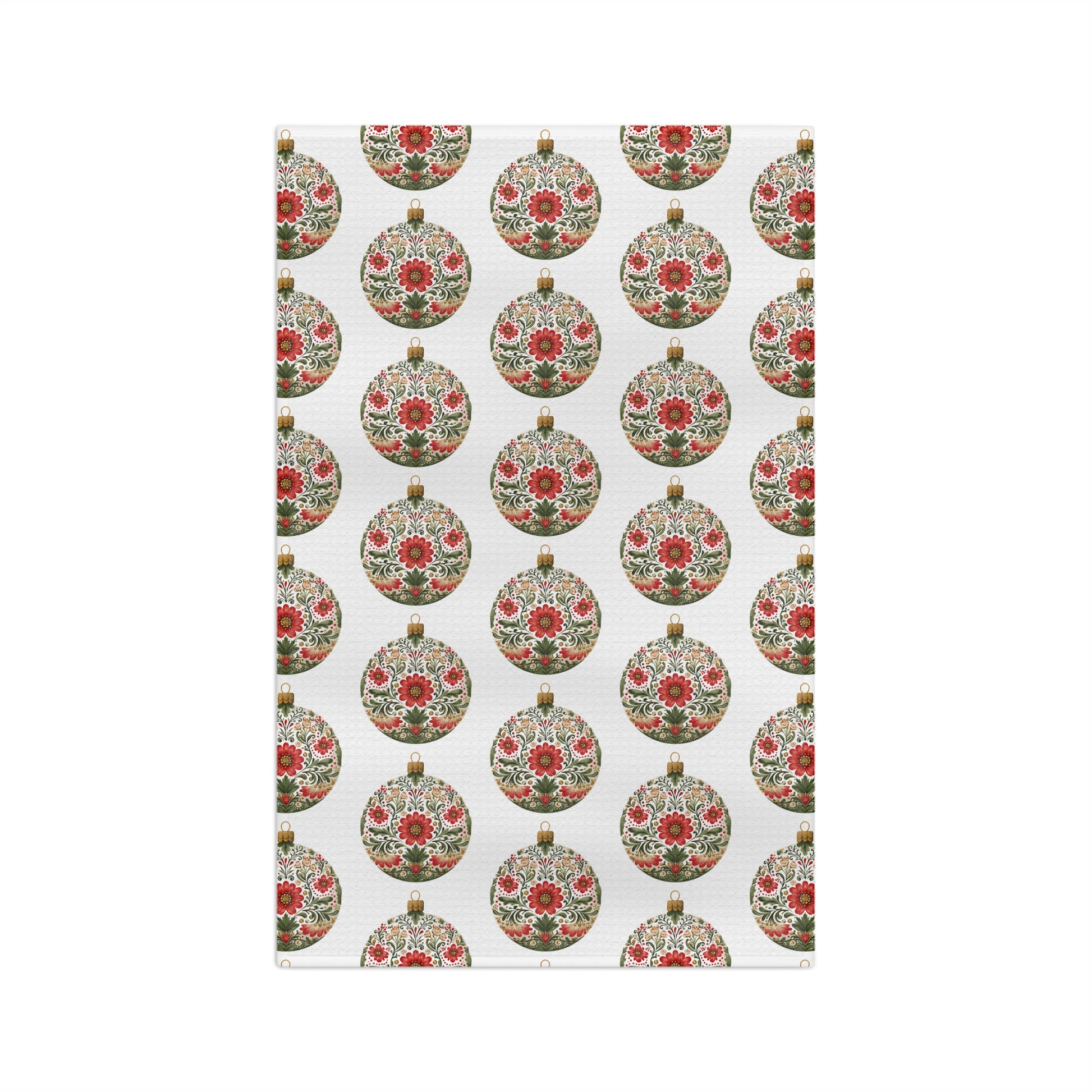 A lightweight, quick-drying microfiber tea towel printed with a repeating vintage ornament motif in warm reds and greens. The fine split fibers make it highly absorbent and fast to dry, while hemmed edges keep the towel looking tidy through repeated use. Use it to wipe hands, dry dishes, line a bread basket, or fold over an apron for a pop of seasonal charm.