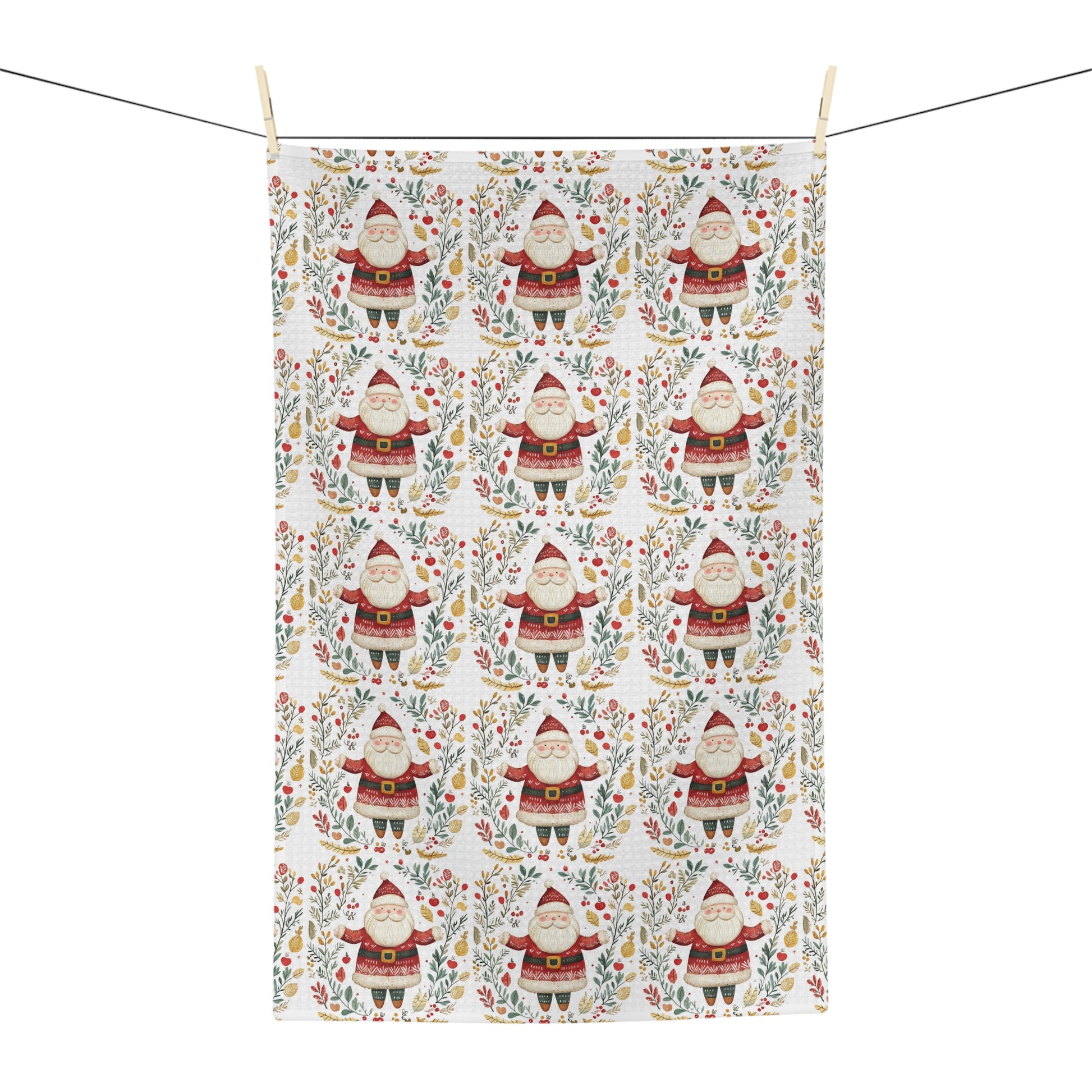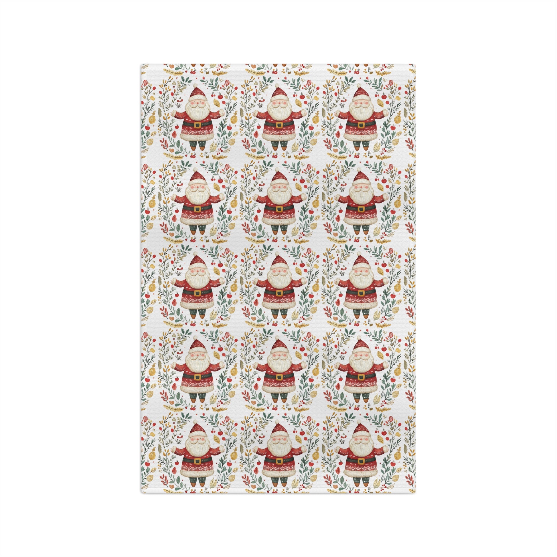 Capture the festive spirit with this microfiber tea towel featuring a folk art design of a cheerful Santa Claus surrounded by Christmas florals and foliage. The intricate details and classic nordic folk style will bring a touch of holiday joy to your kitchen. Perfect for anyone looking to add a whimsical and festive touch to their home decor during the holiday season.