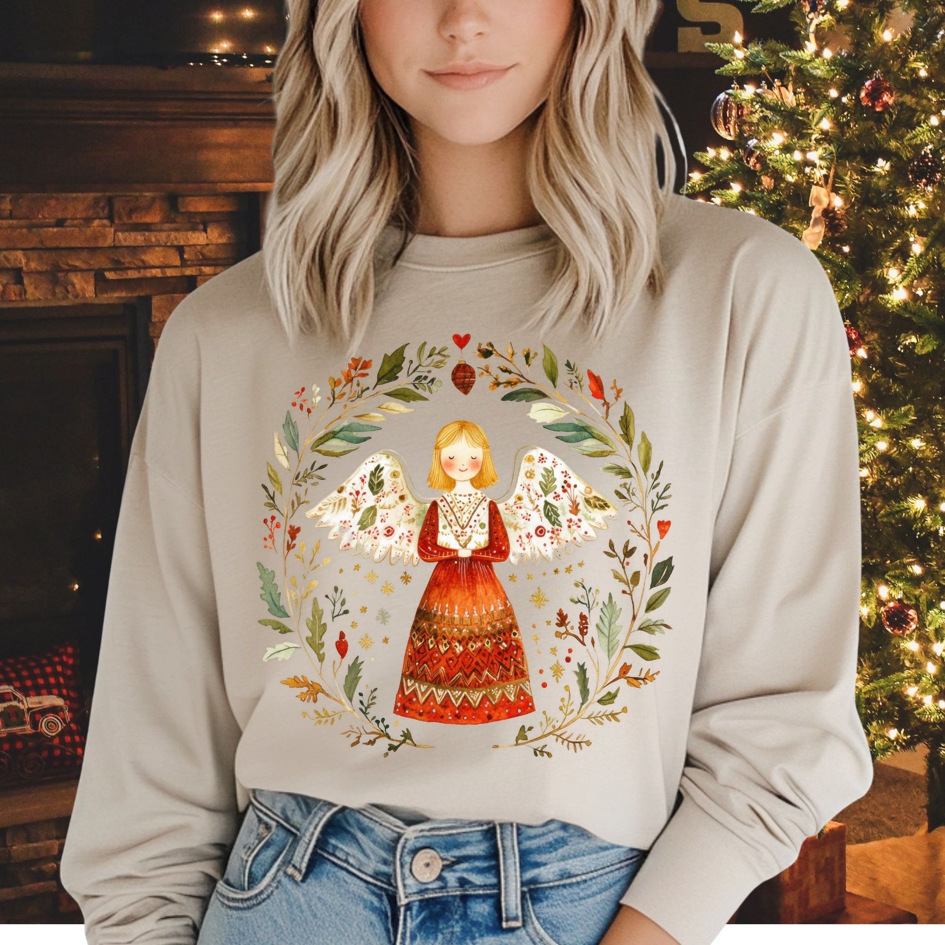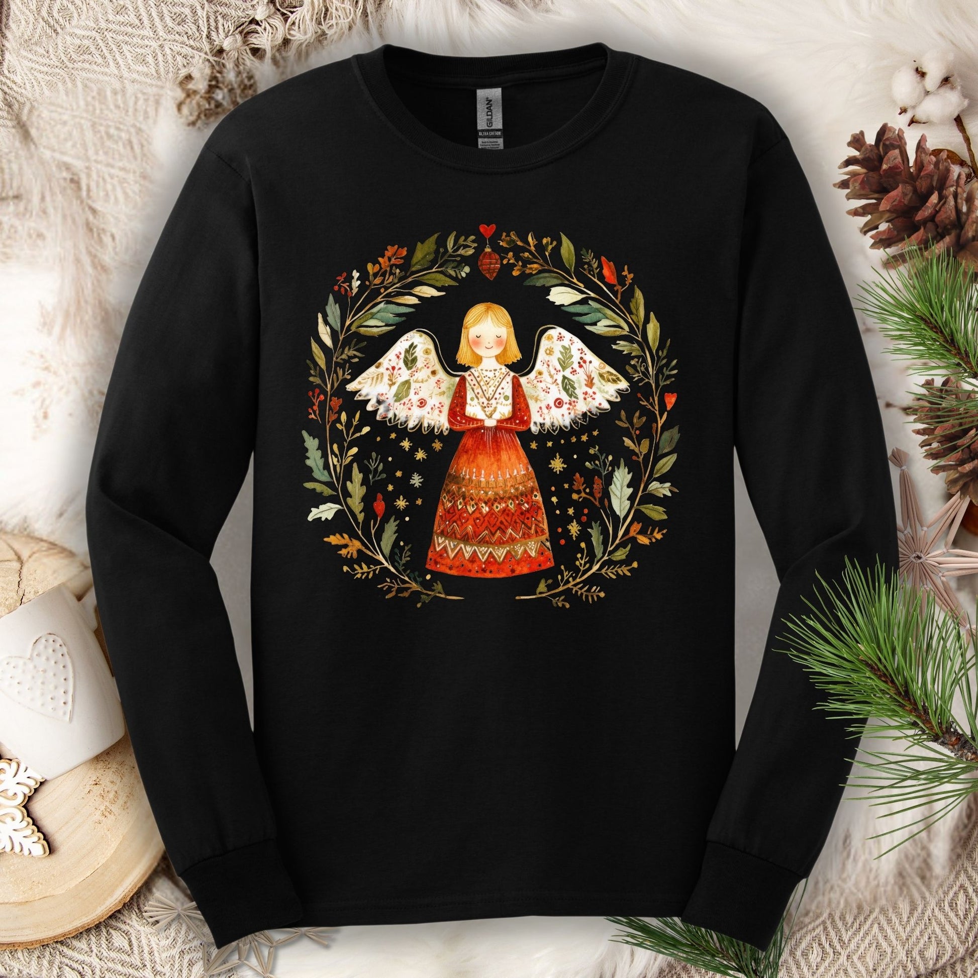 Graceful and timeless, this long sleeve tee features a beautifully detailed folk art angel standing at the heart of a winter wreath. Intricate foliage, berries, and gold accents surround her in a classic palette of red, green, and soft gold. The watercolor-inspired artwork feels both nostalgic and uplifting — a symbol of peace and warmth for the holiday season.