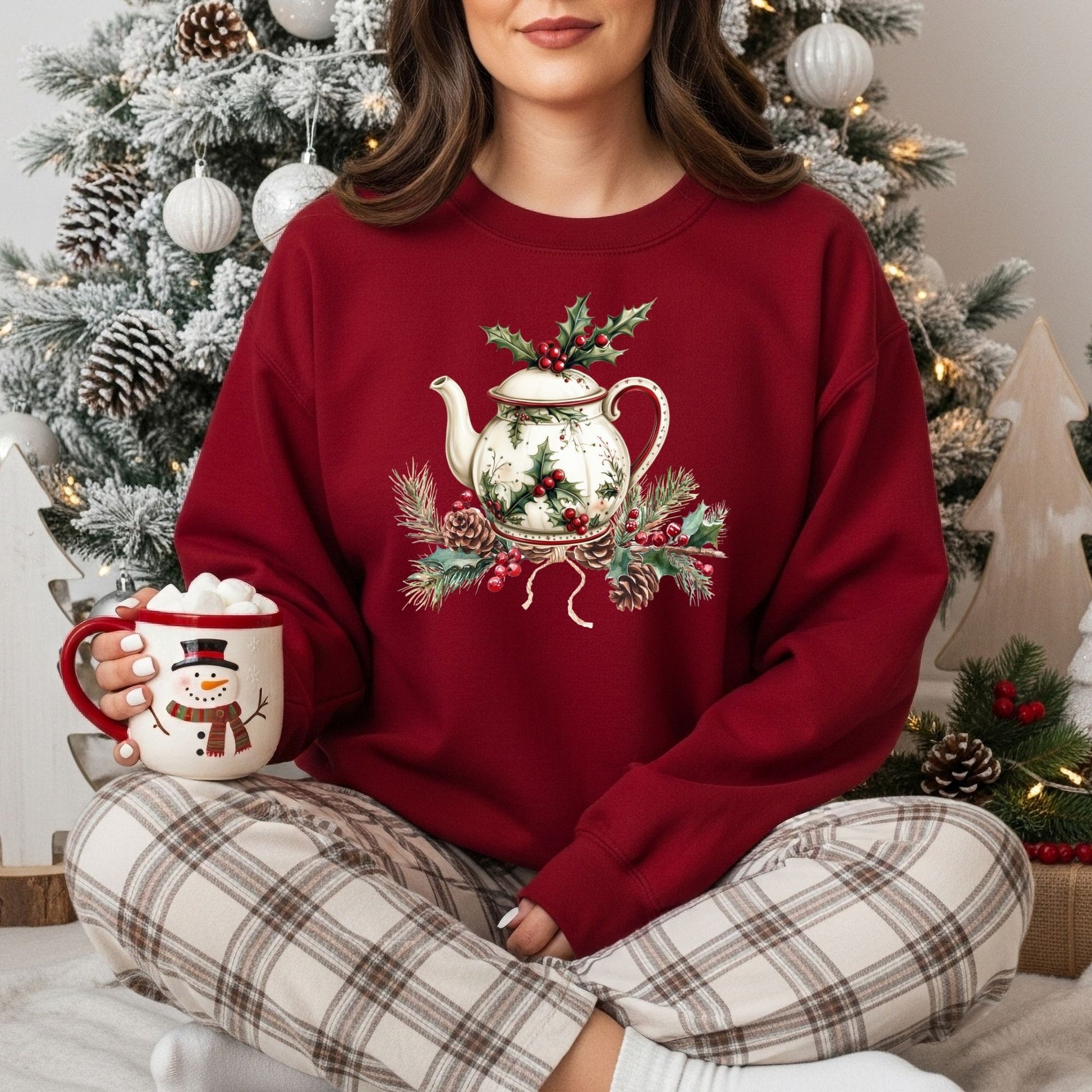 Wrap yourself in nostalgic holiday comfort with this cozy sweatshirt featuring a charming vintage Christmas teapot surrounded by festive greenery and bright holly berries. Painted in soft, traditional Christmas tones, it brings the warmth of old-fashioned gatherings and candlelit cocoa to life — feminine, classic, and beautifully merry. 🎄☕✨