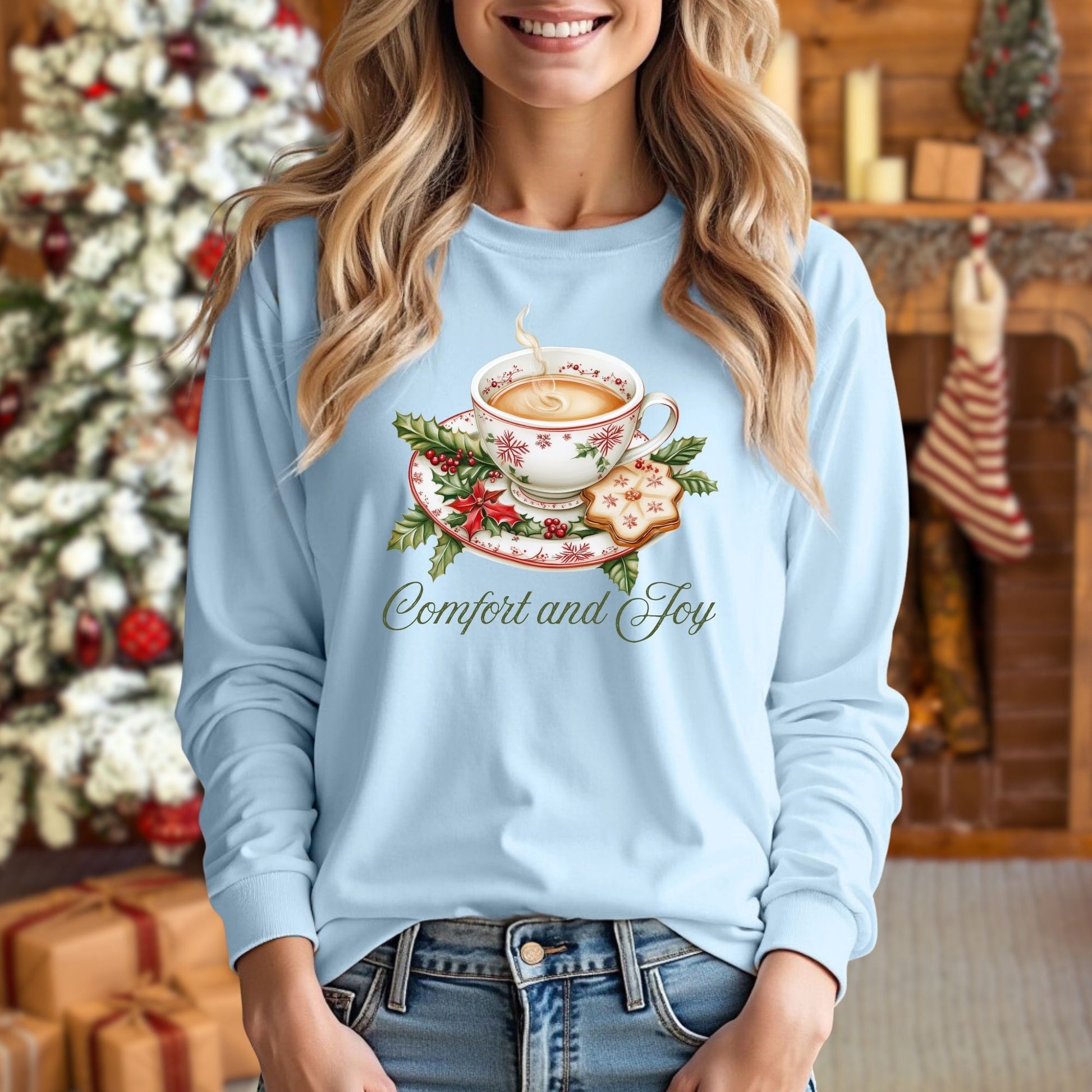 Bring a touch of classic Christmas charm to your wardrobe with this long sleeve tee showcasing a festive watercolor teacup and saucer surrounded by winter evergreens and a cute gingerbread cookie. ✨🍵