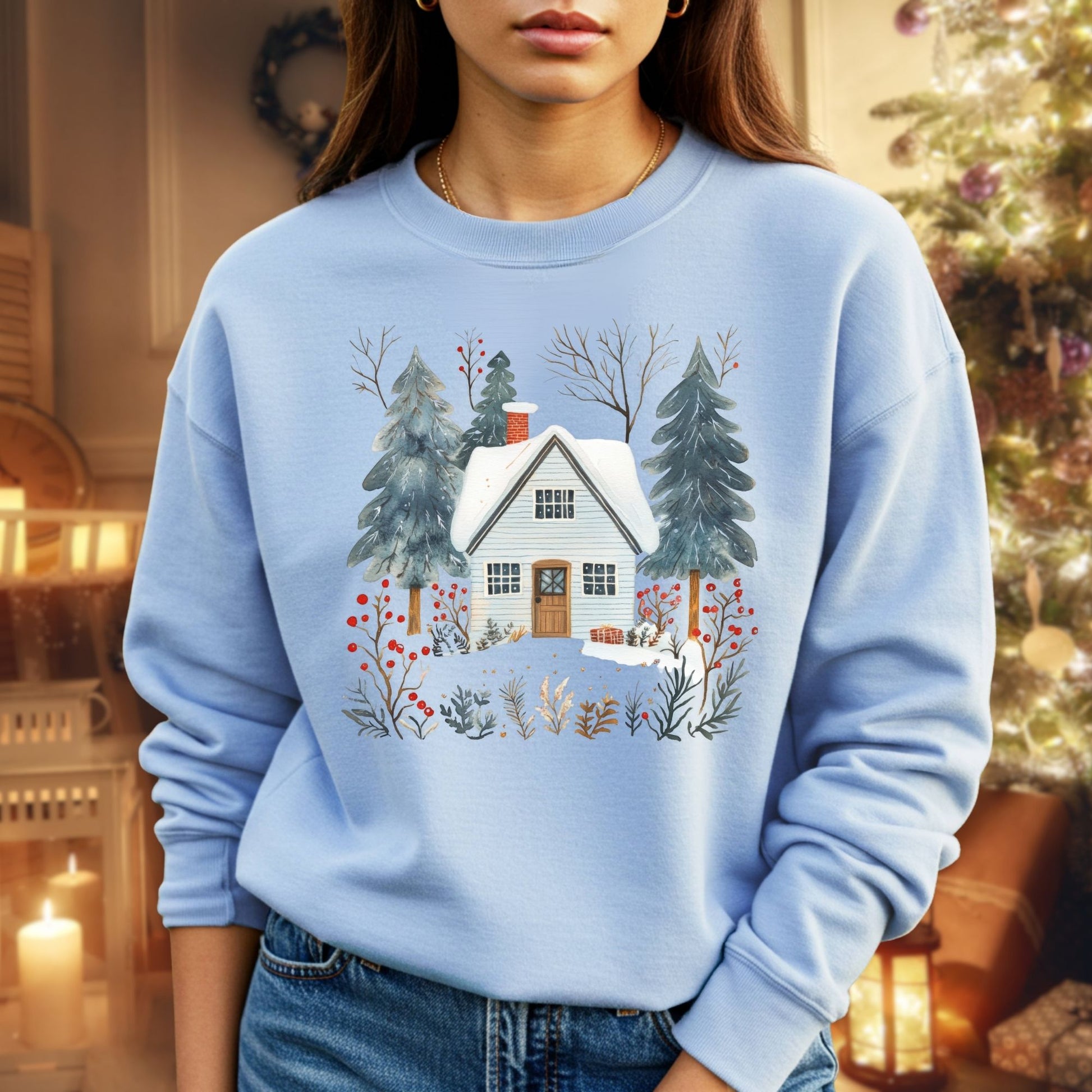 Bring the serenity of a Nordic winter into your wardrobe with this soft, cozy sweatshirt. Featuring a snowy cabin surrounded by pine trees in shades of blue and cream, the design evokes folk-art elegance and peaceful winter nights. Warm, durable, and beautifully detailed, it’s perfect for quiet days at home, layering for outdoor strolls, or curling up with a book by the fire.