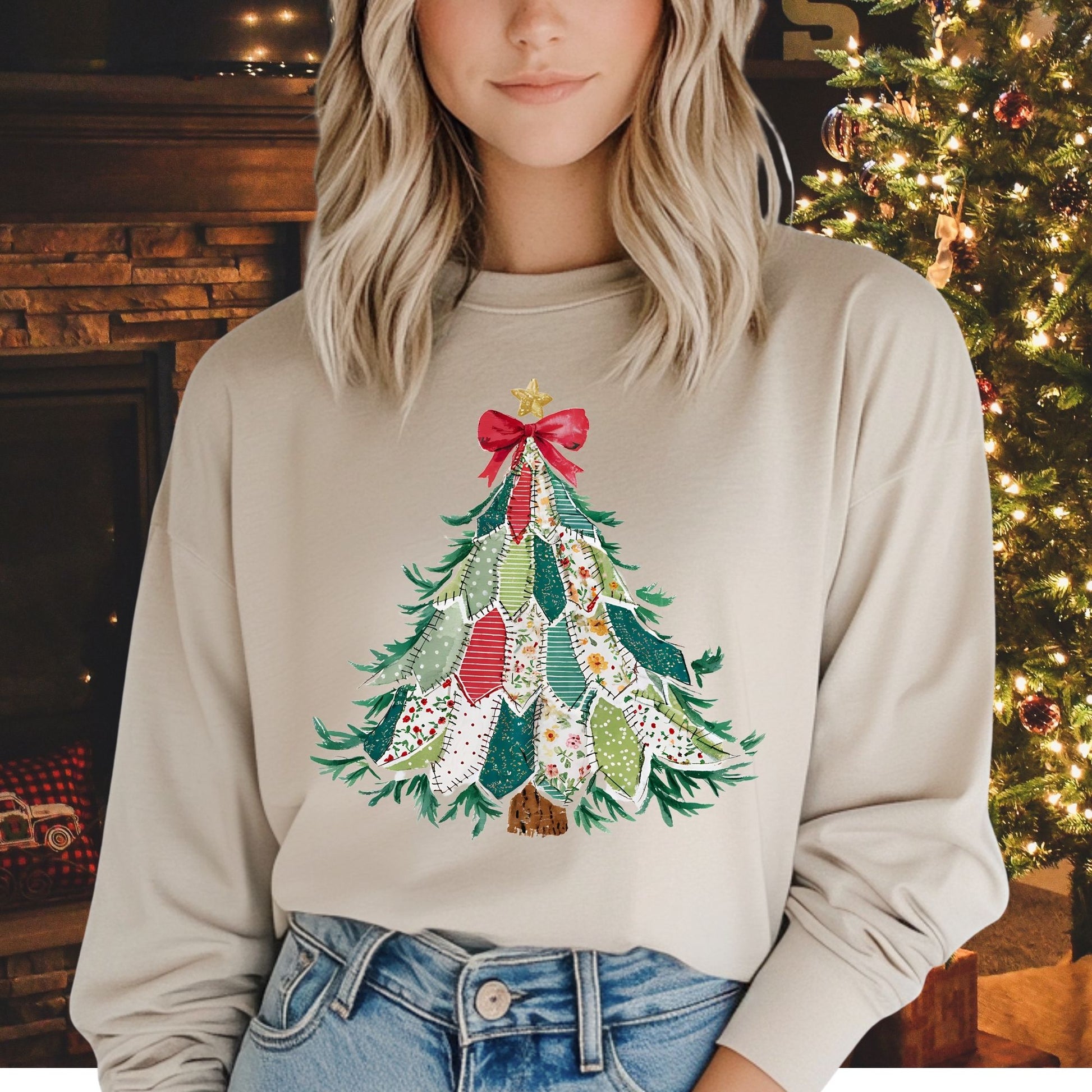 Bring the cozy charm of a handmade Christmas to your wardrobe with this long sleeve tee featuring a country-style quilted Christmas tree print. Each patch of the tree is designed with rustic patterns and soft, homey colors—warm reds, forest greens, and creamy neutrals—for that perfect cottage Christmas feel. Please note this design is professionally printed on the top and is not embroidered or sewn on.