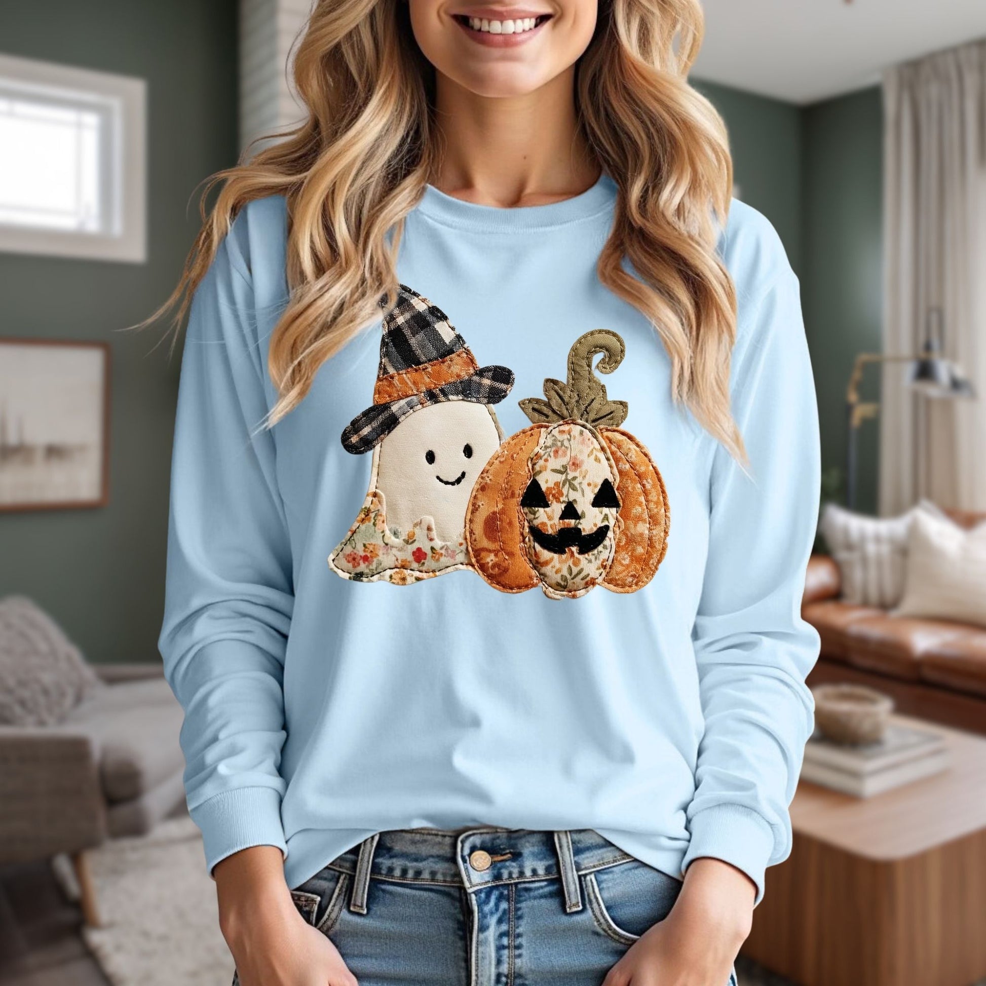 Enjoy spooky season country charm with this adorable long sleeve tee featuring a patchwork ghost and pumpkin print. With soft, quilted patterns and rustic fall tones, this design captures the heart of a handmade autumn—sweet, homey, and full of vintage charm. 👻🎃🧵 Please note this design is professionally printed on the top and is not embroidered or sewn on.