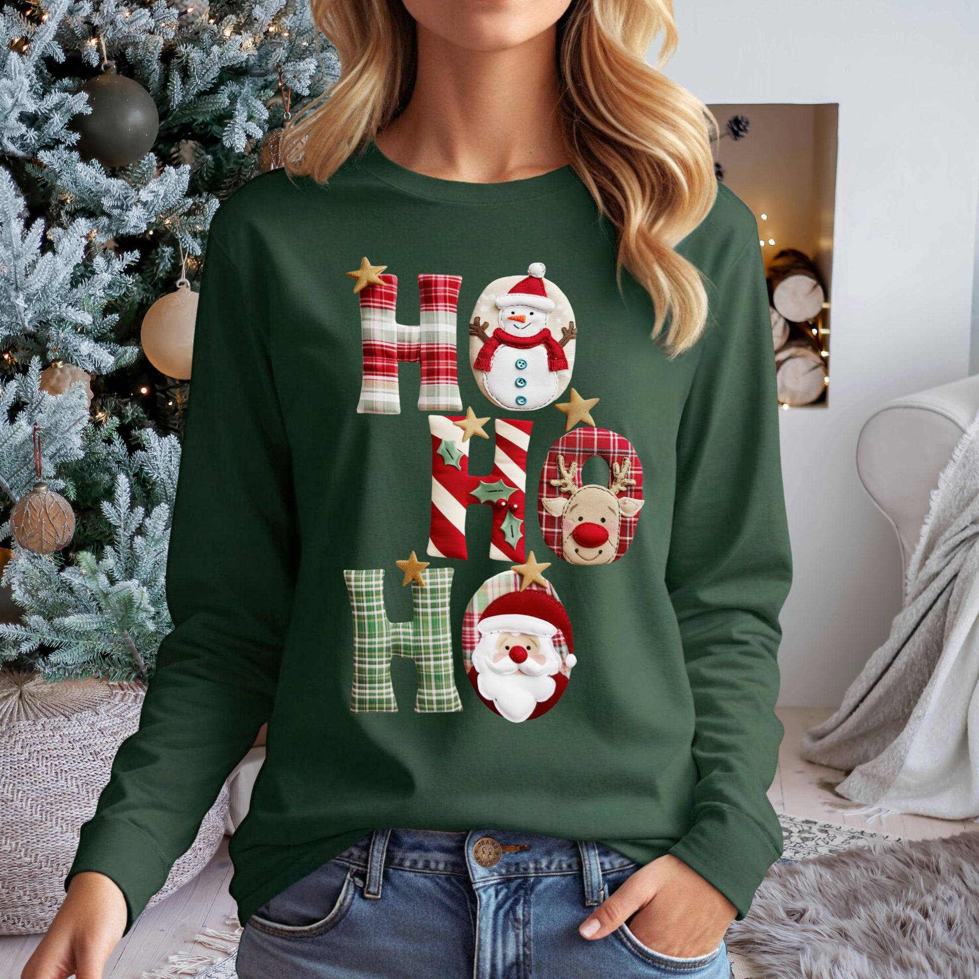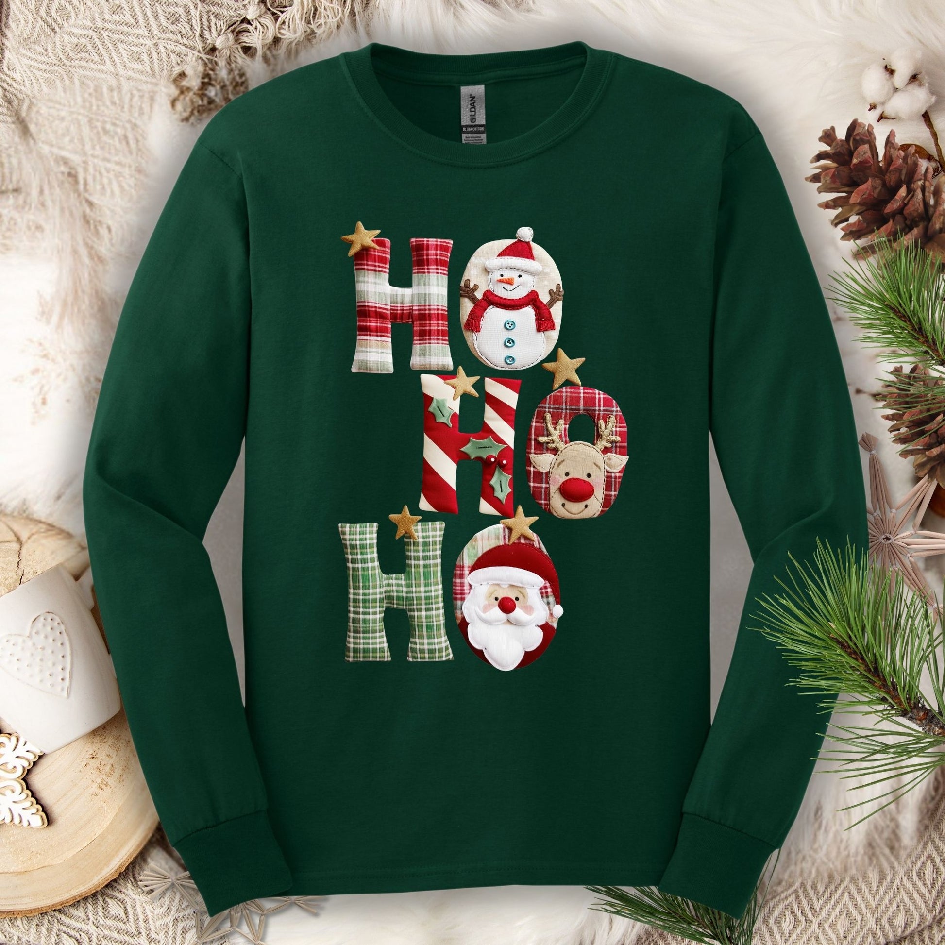 Celebrate the season with cozy, country charm in this long sleeve tee featuring a faux patchwork “Ho Ho Ho” design of Santa, Rudolph, and a snowman. 🌟 With homespun patterns and nostalgic details, it captures the joyful spirit of handmade Christmas décor—festive, heartwarming, and oh-so-cute! Please note this design is professionally printed on the top and is not embroidered or sewn on.