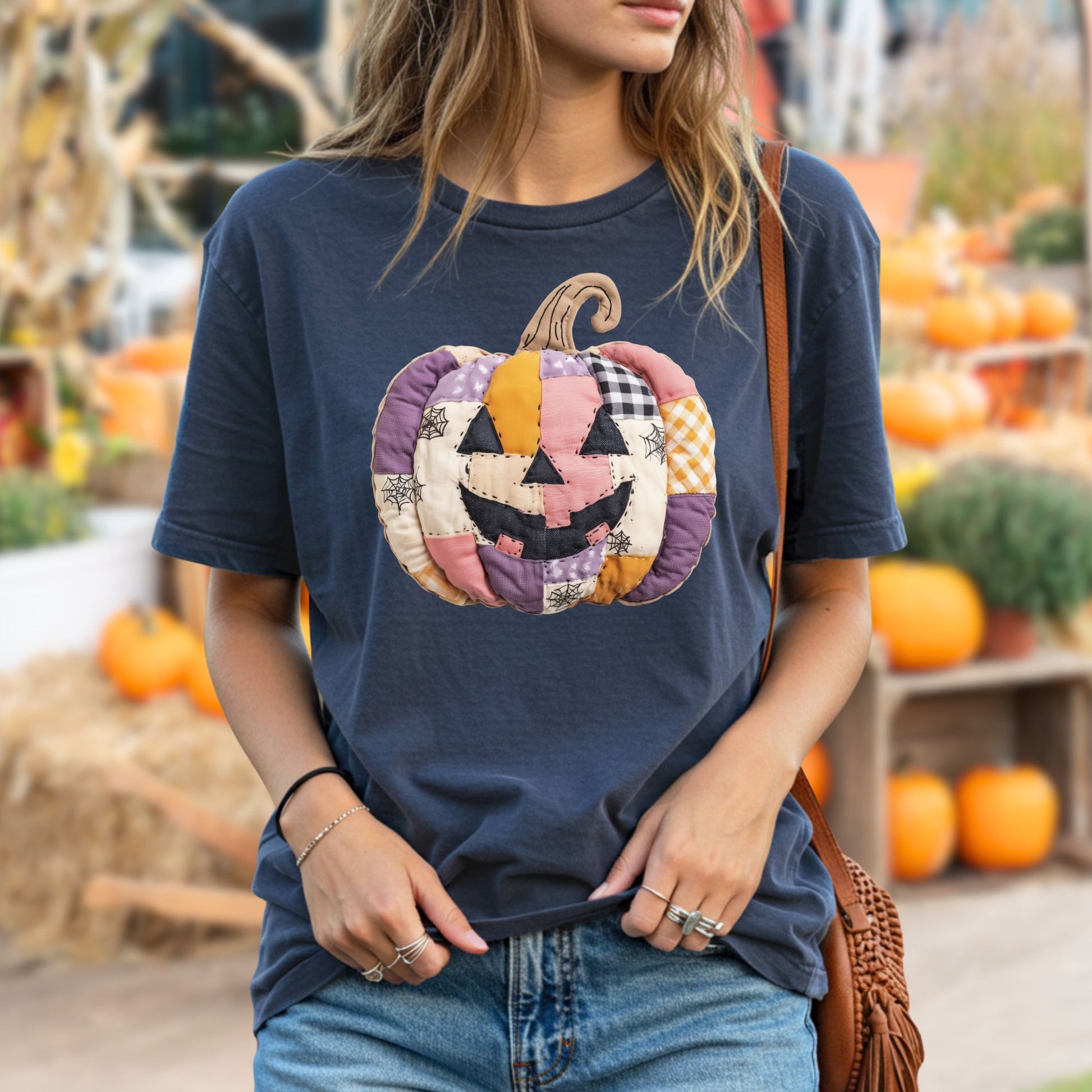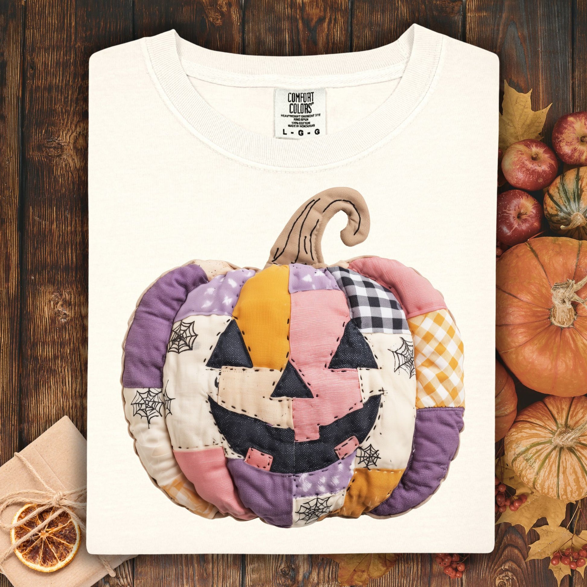 Sweet meets spooky in this cozy Comfort Colors tee featuring an adorable patchwork jack-o’-lantern print! Designed in soft cottage core tones of pinks, purples, and oranges, this pumpkin brings a whimsical, feminine twist to Halloween. Each patch has that hand-stitched, homespun look—like something straight out of a cozy autumn afternoon. Please note this design is professionally printed on the top and is not embroidered or sewn on.