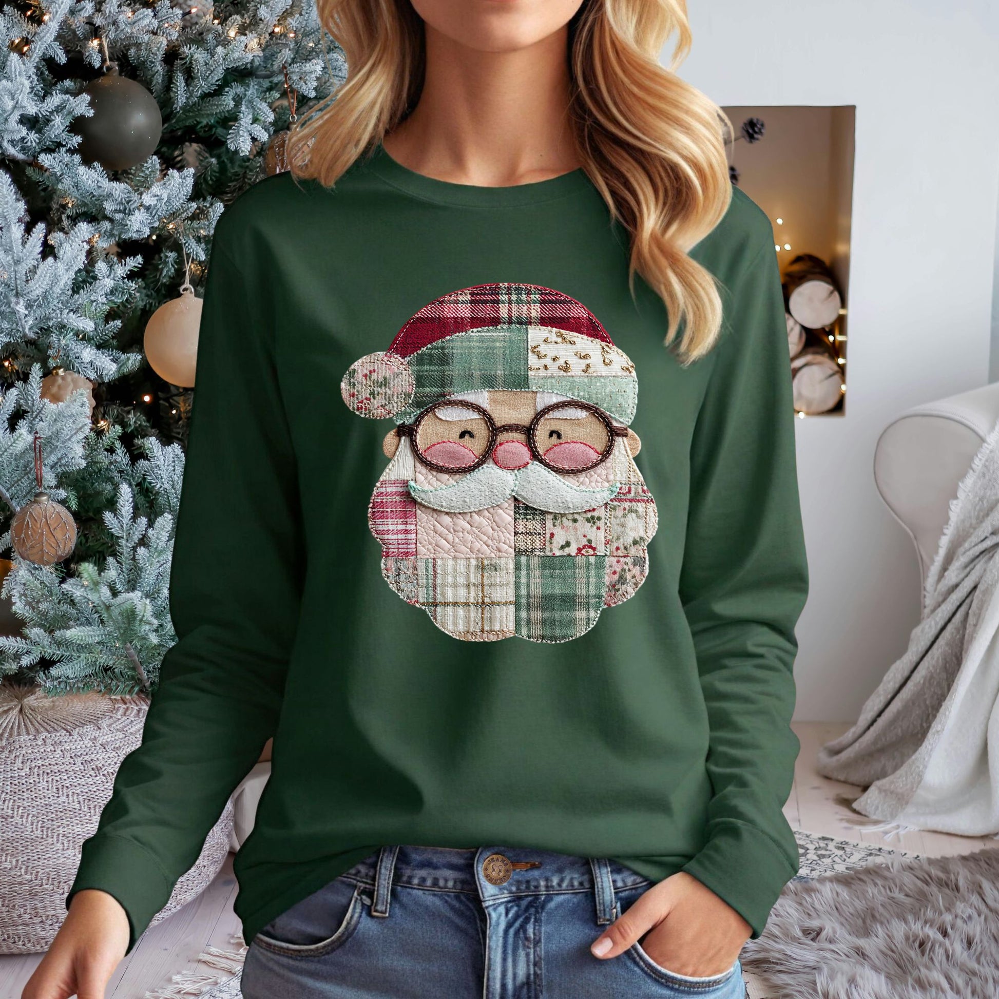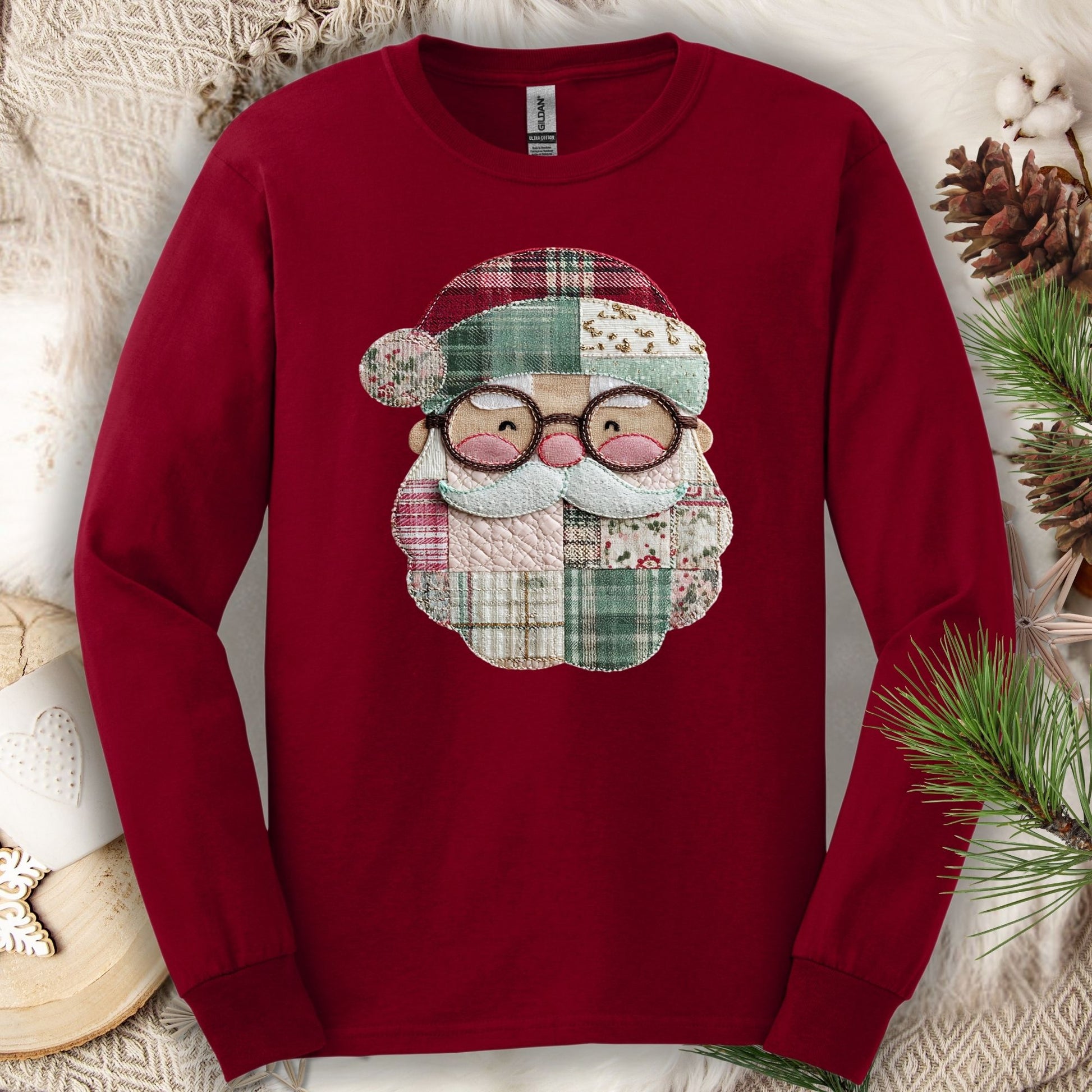 Bring the charm of a handmade Christmas to your wardrobe with this adorable long sleeve tee featuring a printed patchwork quilt design of Santa’s face. With cozy, country-inspired fabrics and warm tones of red, cream, and green, this design feels straight out of a storybook cottage—nostalgic, cheerful, and full of Christmas spirit. Please note this design is professionally printed on the top and is not embroidered or sewn on.
