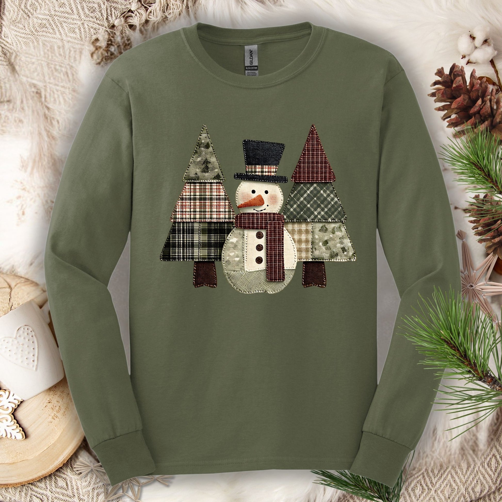 Embrace the cozy charm of winter with this soft long sleeve tee featuring a printed patchwork snowman surrounded by evergreen trees. Designed in warm, earthy tones with delicate cottage core details, this piece captures the comforting nostalgia of a handmade quilt on a snowy day—rustic, heartwarming, and timeless. Please note this design is professionally printed on the top and is not embroidered or sewn on.