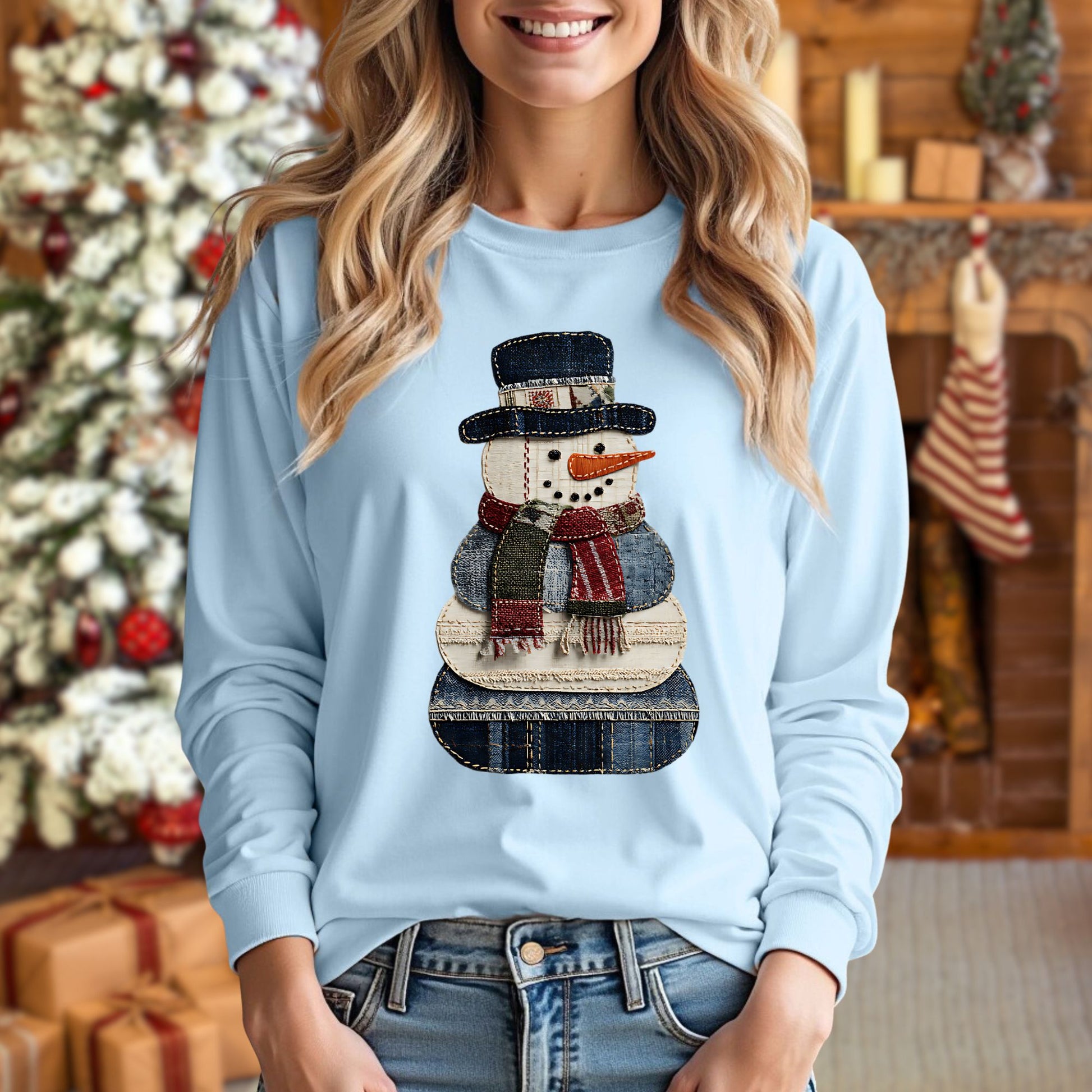 Embrace the cozy charm of winter with this soft long sleeve tee featuring a quilted patchwork snowman surrounded by evergreen trees. Designed in warm, earthy tones with delicate cottage core details, this piece captures the comforting nostalgia of a handmade quilt on a snowy day—rustic, heartwarming, and timeless. Please note this design is professionally printed on the top and is not embroidered or sewn on.