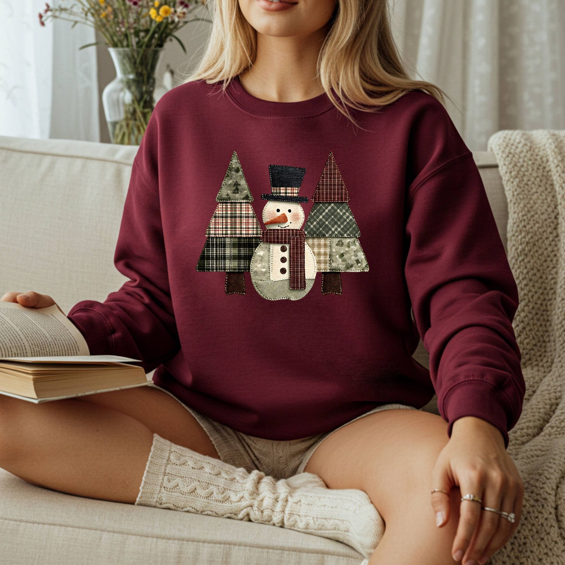 Wrap yourself in the cozy charm of winter with this crewneck sweatshirt featuring a quilted patchwork print of a snowman surrounded by evergreen trees. With soft earth tones and cottage core details, this design feels like a warm quilt on a snowy day—nostalgic, handmade, and full of rustic beauty. 🧵⛄🌲 Please note this design is professionally printed on the top and is not embroidered or sewn on.
