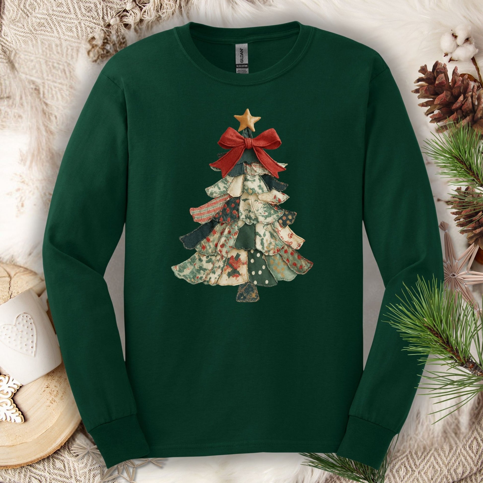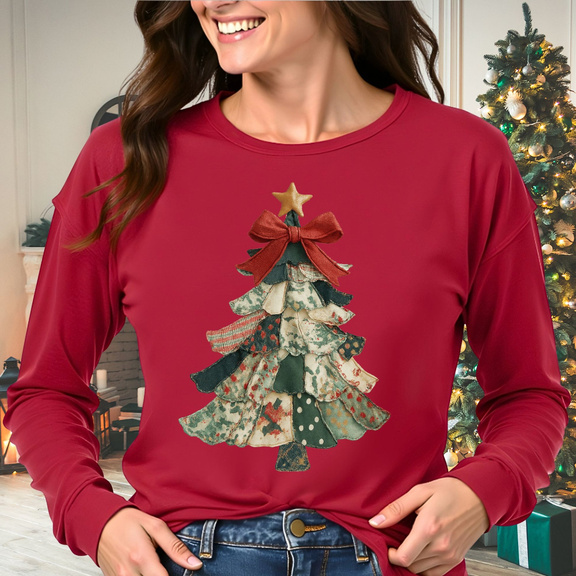 Classic, cozy, and full of heart — this long sleeve tee brings the comfort of a handmade quilt to your winter wardrobe. The design features a beautifully detailed patchwork Christmas tree, softly shaded in vintage holiday colors and textures that look lovingly sewn together.
