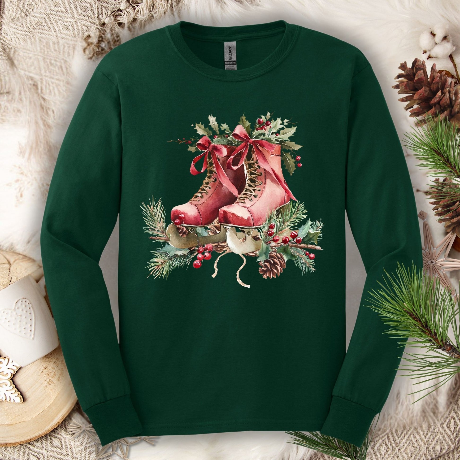 There’s a magic in old-fashioned winter traditions… the kind that live in memory like flickering candlelight. These watercolor-painted red skates rest atop holly leaves and winter evergreens, capturing the charm of skating ponds, rosy cheeks, and simple joys.