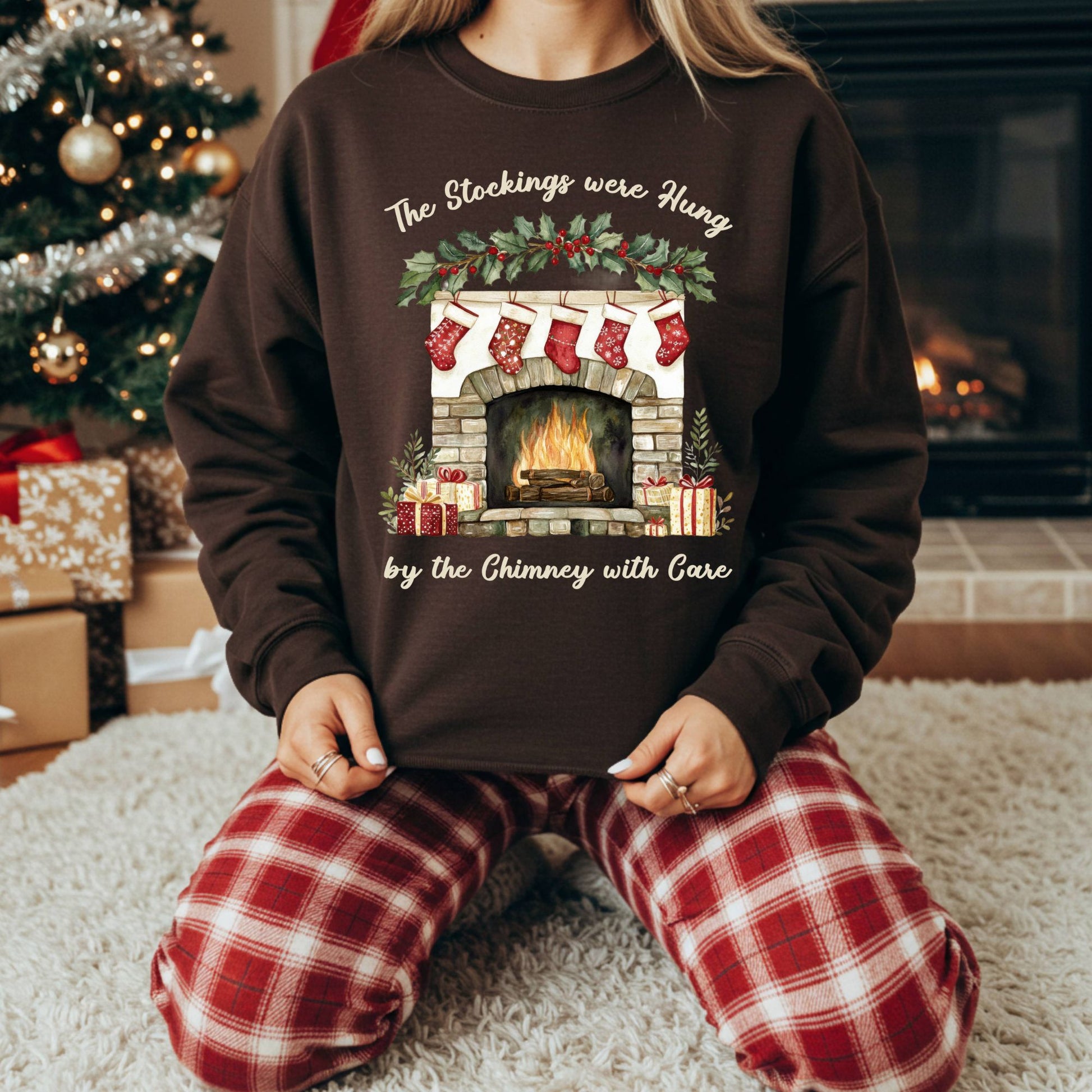 Wrap yourself in warmth and nostalgia with this cozy Gildan crewneck sweatshirt featuring a beautiful watercolor painting of a Christmas fireplace. 🕯️🎄 Red stockings hang gently from the mantel, surrounded by holly berries and evergreen branches — capturing the timeless charm of “the stockings were hung by the chimney with care.”