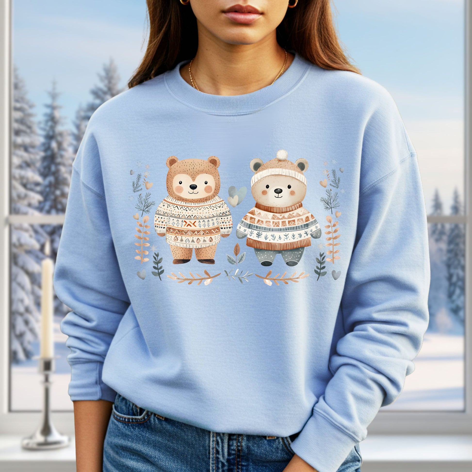 Embrace the warmth and charm of the season with our Winter Fair Isle Love Bears Sweatshirt, featuring delightful love bears dressed in cozy fair isle sweaters. The artful design is beautifully set against a backdrop of gentle winter foliage, snowflakes, and hearts, making it a perfect expression of winter joys.