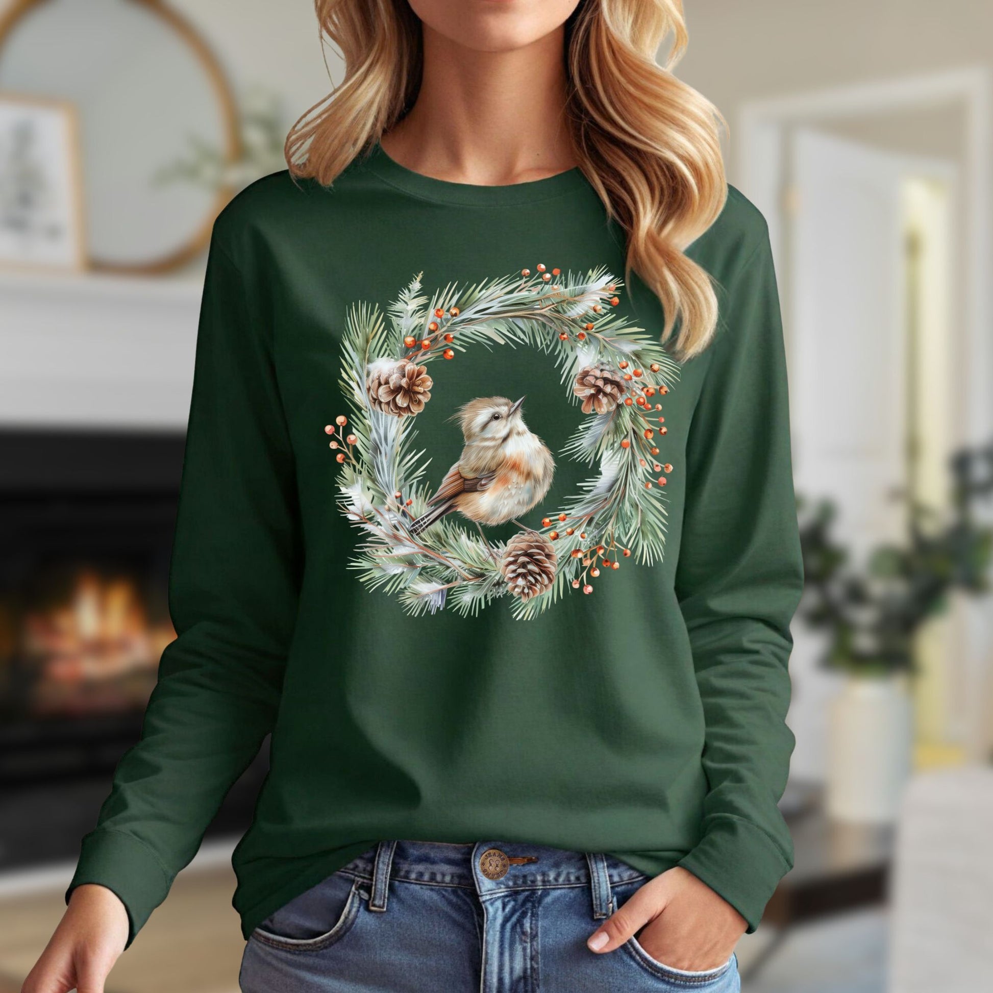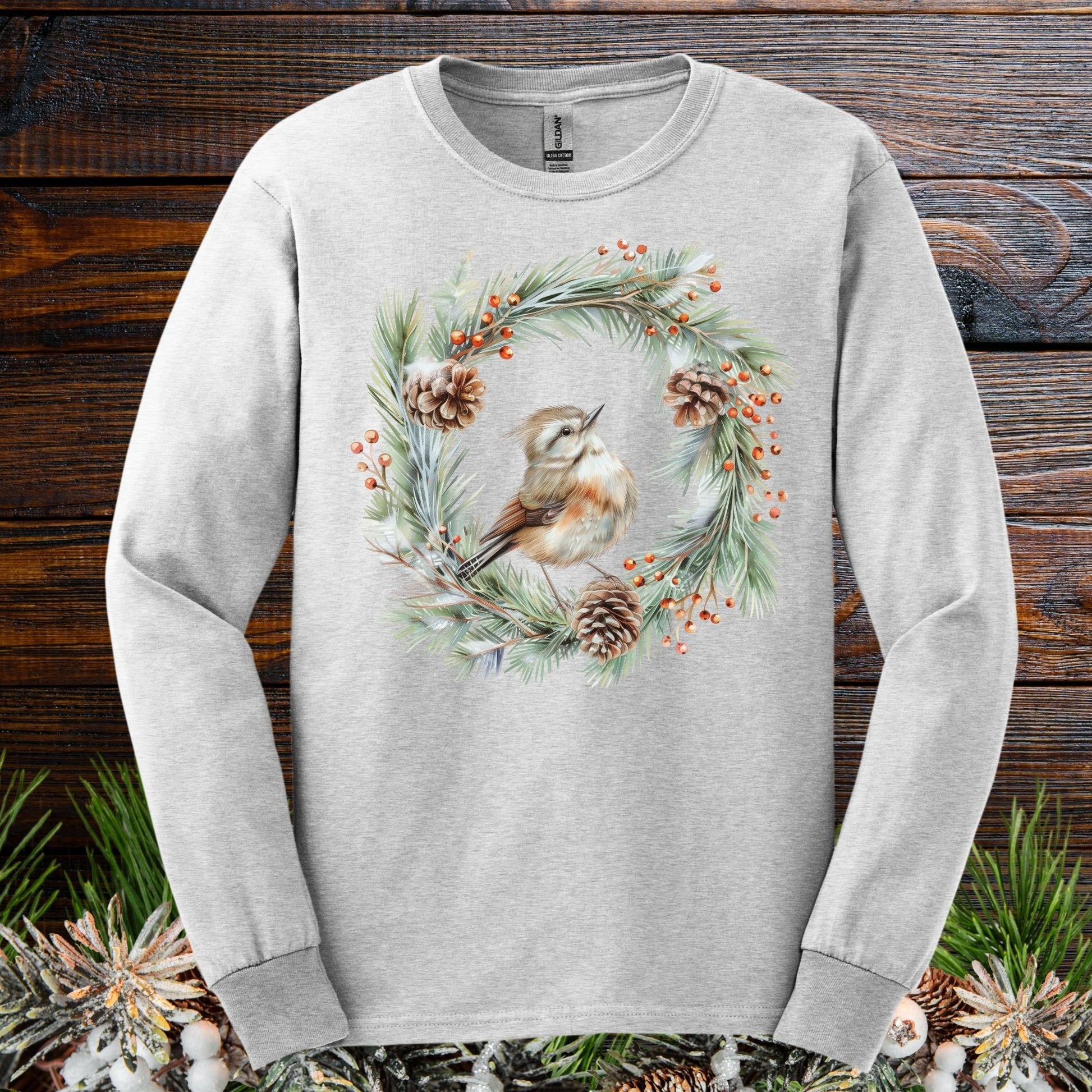 Immerse yourself in nature's beauty with our rustic woodland wren long sleeve t-shirt. Adorned with a delicate watercolor depiction of a winter wren nestled in a snowy wreath of evergreens and pinecones, this tee captures the essence of tranquil winter charm, making it a perfect pick for bird lovers and nature enthusiasts alike.