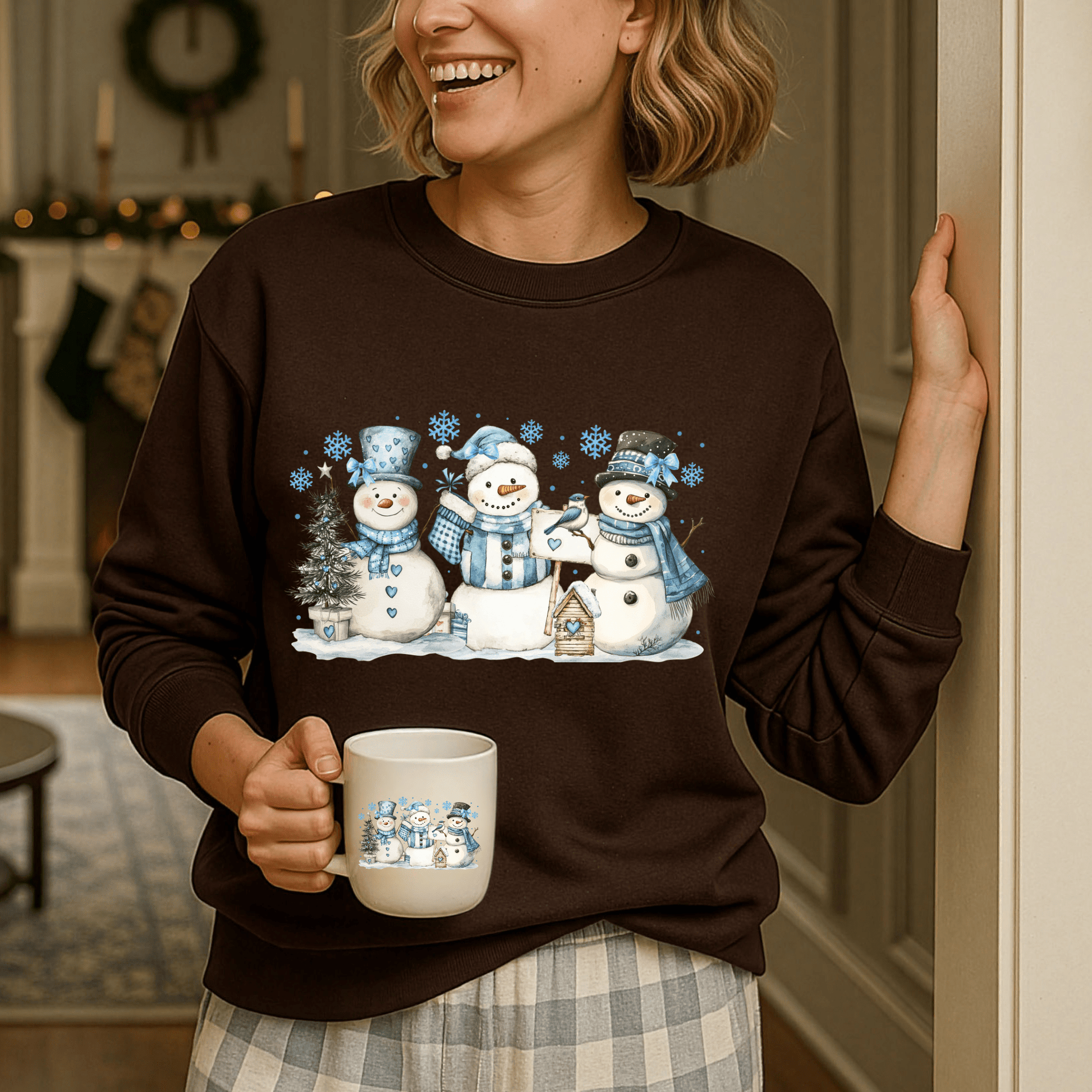 Embrace the charm of winter with our Woodland Snowmen Watercolor Sweatshirt, featuring a delightful watercolor illustration of three woodland snowmen adorned with blue hats and scarves, complemented by a birdhouse and whimsical birds. This unique design makes it a perfect addition to your cold-weather wardrobe.